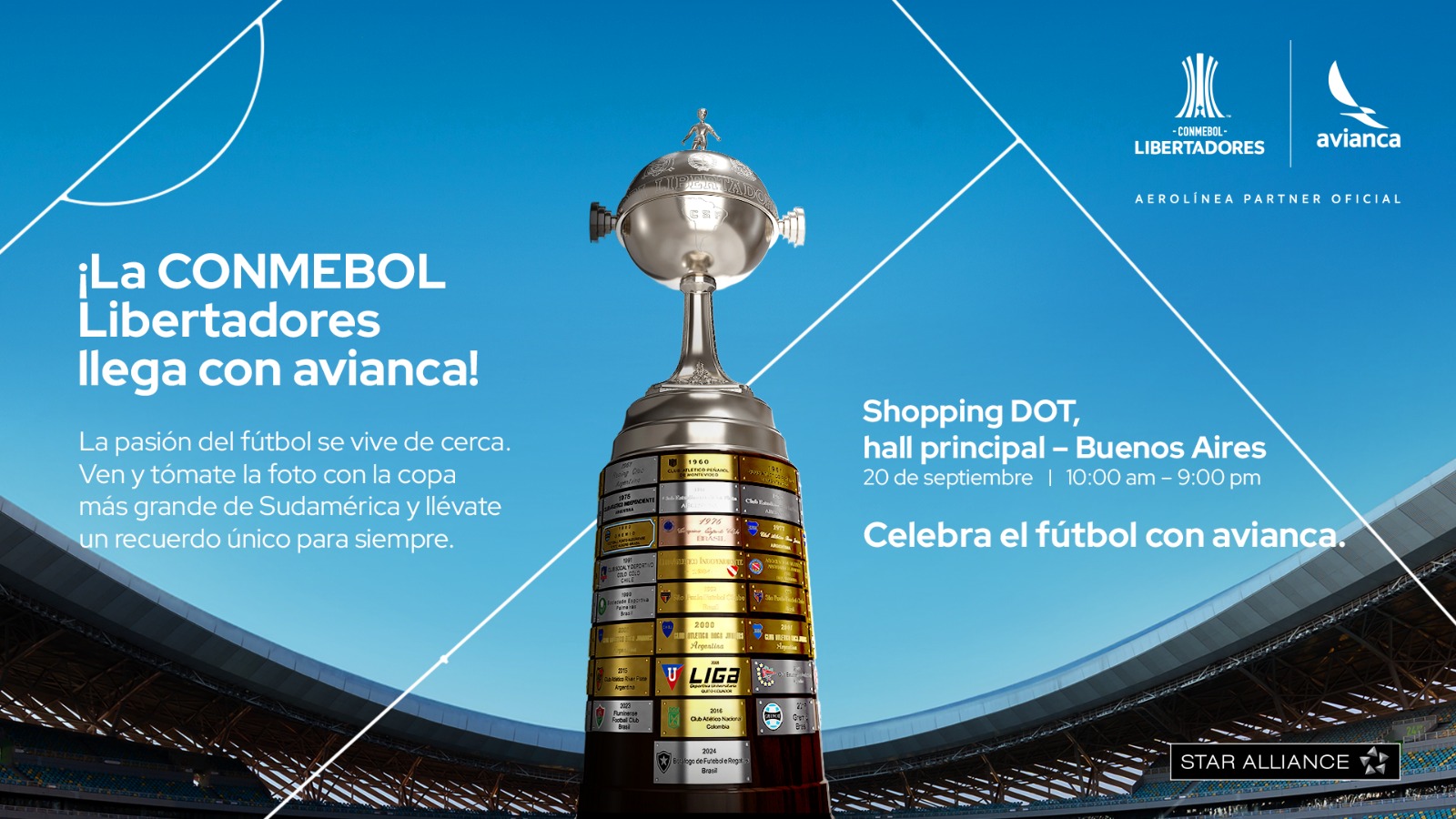 En el marco de su patrocinio con CONMEBOL para el ciclo 2025-2026, Avianca acerca a los hinchas la posibilidad de sacarse una foto con el Trofeo de la CONMEBOL Libertadores. La exhibición se realizará en el Shopping DOT (Vedia 3600, CABA) con acceso libre y gratuito, desde las 10:00 a 22:00 h.